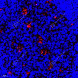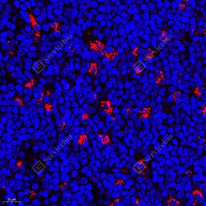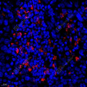 IF检测IL-4I1/LAO蛋白(货号 GB111982)(红色). 样品: 人扁桃体, 4%多聚甲醛 (货号G1101) 固定12-24小时. 抗原修复: Tris-EDTA抗原修复液(pH 9.0) (G1203), 98℃, 20分钟. 封闭: 3% BSA(货号GC305010)的PBS溶液, 室温孵育30分钟. —抗: 1: 300稀释, 4℃ 孵育过夜. 二抗: Cy3标记山羊抗兔IgG (H+L) (货号GB21303), 1: 300稀释, 室温孵育1小时. |