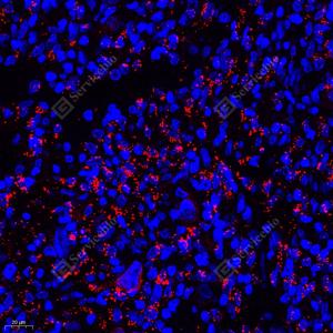 IF检测IL-4I1/LAO蛋白(货号 GB111982)(红色). 样品: 人B细胞淋巴瘤, 4%多聚甲醛 (货号G1101) 固定12-24小时. 抗原修复: Tris-EDTA抗原修复液(pH 9.0) (G1203), 98℃, 20分钟. 封闭: 3% BSA(货号GC305010)的PBS溶液, 室温孵育30分钟. —抗: 1: 300稀释, 4℃ 孵育过夜. 二抗: Cy3标记山羊抗兔IgG (H+L) (货号GB21303), 1: 300稀释, 室温孵育1小时. |