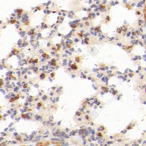 IHC检测GCSH蛋白(货号 GB114523). 样品: 小鼠肺, 4%多聚甲醛 (货号G1101) 固定12-24小时. 抗原修复: 柠檬酸抗原修复液(干粉, pH 6.0) (G1201), 98℃, 20分钟. —抗: 1: 300稀释, 4℃ 孵育过夜. 二抗: HRP标记山羊抗兔IgG (H+L) (货号GB23303), 1: 200稀释, 室温孵育1小时. |
