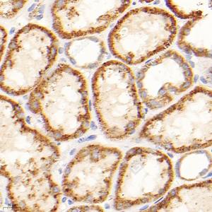 IHC检测GCSH蛋白(货号 GB114523). 样品: 人肾脏, 4%多聚甲醛 (货号G1101) 固定12-24小时. 抗原修复: 柠檬酸抗原修复液(干粉, pH 6.0) (G1201), 98℃, 20分钟. —抗: 1: 300稀释, 4℃ 孵育过夜. 二抗: HRP标记山羊抗兔IgG (H+L) (货号GB23303), 1: 200稀释, 室温孵育1小时. |