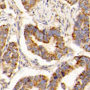 IHC检测GCSH蛋白(货号 GB114523). 样品: 人胃, 4%多聚甲醛 (货号G1101) 固定12-24小时. 抗原修复: 柠檬酸抗原修复液(干粉, pH 6.0) (G1201), 98℃, 20分钟. —抗: 1: 300稀释, 4℃ 孵育过夜. 二抗: HRP标记山羊抗兔IgG (H+L) (货号GB23303), 1: 200稀释, 室温孵育1小时. |