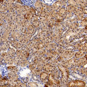IHC检测GCSH蛋白(货号 GB114523). 样品: 大鼠肾, 4%多聚甲醛 (货号G1101) 固定12-24小时. 抗原修复: 柠檬酸抗原修复液(干粉, pH 6.0) (G1201), 98℃, 20分钟. —抗: 1: 300稀释, 4℃ 孵育过夜. 二抗: HRP标记山羊抗兔IgG (H+L) (货号GB23303), 1: 200稀释, 室温孵育1小时. |