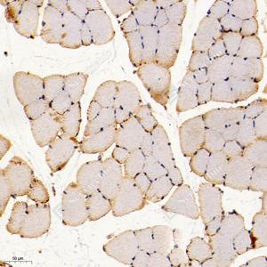 IHC检测GCSH蛋白(货号 GB114523). 样品: 大鼠骨骼肌, 4%多聚甲醛 (货号G1101) 固定12-24小时. 抗原修复: 柠檬酸抗原修复液(干粉, pH 6.0) (G1201), 98℃, 20分钟. —抗: 1: 300稀释, 4℃ 孵育过夜. 二抗: HRP标记山羊抗兔IgG (H+L) (货号GB23303), 1: 200稀释, 室温孵育1小时. |
