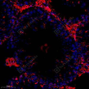 IF检测GCSH蛋白(货号 GB114523)(红色). 样品: 小鼠睾丸, 4%多聚甲醛 (货号G1101) 固定12-24小时. 抗原修复: Tris-EDTA抗原修复液 (pH 9.0) (G1203), 98℃, 20分钟. 封闭: 3% BSA(货号GC305010)的PBS溶液, 室温孵育30分钟. —抗: 1: 300, 4℃ 孵育过夜. 二抗: Cy3标记山羊抗兔IgG (H+L) (货号GB21303), 1: 300稀释, 室温孵育1小时. |