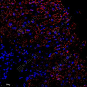 IF检测GCSH蛋白(货号 GB114523)(红色). 样品: 人肝, 4%多聚甲醛 (货号G1101) 固定12-24小时. 抗原修复: Tris-EDTA抗原修复液 (pH 9.0) (G1203), 98℃, 20分钟. 封闭: 3% BSA(货号GC305010)的PBS溶液, 室温孵育30分钟. —抗: 1: 300, 4℃ 孵育过夜. 二抗: Cy3标记山羊抗兔IgG (H+L) (货号GB21303), 1: 300稀释, 室温孵育1小时. |