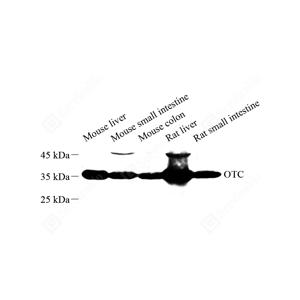 WB检测Ornithine Carbamoyltransferase/OTC蛋白(货号 GB111457). 样品: 经RIPA裂解液(货号G2002)处理的蛋白质. 封闭: 封闭: 3%脱脂牛奶(货号GC310001)溶于TBST溶液, 室温孵育1小时. —抗: 1: 500稀释, 4℃ 孵育过夜. 二抗: HRP标记山羊抗兔IgG (H+L) (货号GB23303), 1: 5000稀释, 室温孵育1小时. |