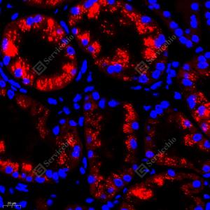 IF检测AMT蛋白(货号 GB112457)(红色). 样品: 人肾, 4%多聚甲醛 (货号G1101) 固定12-24小时. 抗原修复: Tris-EDTA抗原修复液(pH 9.0) (G1203), 98℃, 20分钟. 封闭: 3% BSA(货号GC305010)的PBS溶液, 室温孵育30分钟. —抗: 1: 500稀释, 4℃ 孵育过夜. 二抗: Cy3标记山羊抗兔IgG (H+L) (货号GB21303), 1: 300稀释, 室温孵育1小时. |