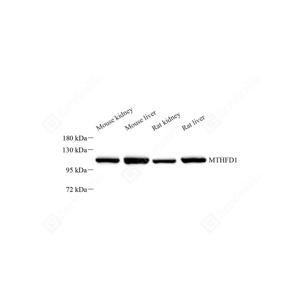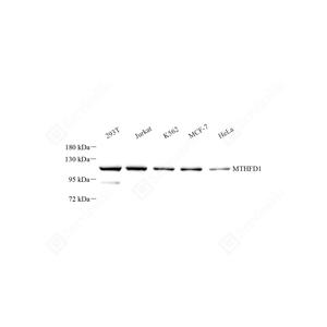 WB检测MTHFD1蛋白(货号 GB112031). 样品: 经RIPA裂解液(货号G2002)处理的蛋白质. 封闭: 3%脱脂牛奶(货号GC310001)溶于TBST溶液, 室温孵育1小时. —抗: 1: 1000稀释, 4℃ 孵育过夜. 二抗: HRP标记山羊抗兔IgG (H+L) (货号GB23303), 1: 5000稀释, 室温孵育1小时. |