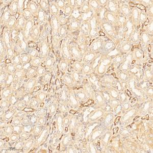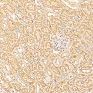 IHC检测MTHFR蛋白(货号 GB114943). 样品: 小鼠肾, 4%多聚甲醛 (货号G1101) 固定12-24小时. 抗原修复: Tris-EDTA抗原修复液(pH 9.0) (G1203), 98℃, 20分钟. —抗: 1: 1000稀释, 4℃ 孵育过夜. 二抗: HRP标记山羊抗兔IgG (H+L) (货号GB23303), 1: 200稀释, 室温孵育1小时. |