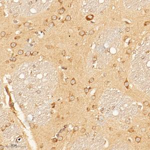 IHC检测MTHFR蛋白(货号 GB114943). 样品: 大鼠脑, 4%多聚甲醛 (货号G1101) 固定12-24小时. 抗原修复: Tris-EDTA抗原修复液(pH 9.0) (G1203), 98℃, 20分钟. —抗: 1: 1000稀释, 4℃ 孵育过夜. 二抗: HRP标记山羊抗兔IgG (H+L) (货号GB23303), 1: 200稀释, 室温孵育1小时. |
