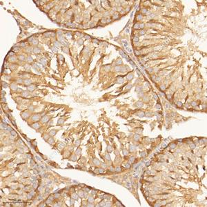 IHC检测MTHFR蛋白(货号 GB114943). 样品: 大鼠睾丸, 4%多聚甲醛 (货号G1101) 固定12-24小时. 抗原修复: Tris-EDTA抗原修复液(pH 9.0) (G1203), 98℃, 20分钟. —抗: 1: 1000稀释, 4℃ 孵育过夜. 二抗: HRP标记山羊抗兔IgG (H+L) (货号GB23303), 1: 200稀释, 室温孵育1小时. |