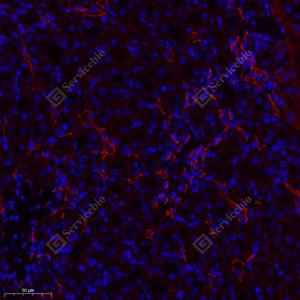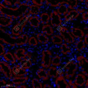 IF检测MTHFR蛋白(货号 GB114943)(红色). 样品: 小鼠肾, 4%多聚甲醛 (货号G1101) 固定12-24小时. 抗原修复: Tris-EDTA抗原修复液(pH 9.0) (G1203), 98℃, 20分钟. 封闭: 3% BSA(货号GC305010)的PBS溶液, 室温孵育30分钟. —抗: 1: 1000稀释, 4℃ 孵育过夜. 二抗: Cy3标记山羊抗兔IgG (H+L) (货号GB21303), 1: 300稀释, 室温孵育1小时. |