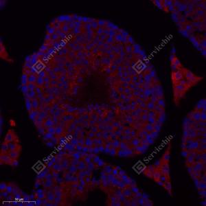 IF检测MTHFR蛋白(货号 GB114943)(红色). 样品: 小鼠睾丸, 4%多聚甲醛 (货号G1101) 固定12-24小时. 抗原修复: Tris-EDTA抗原修复液(pH 9.0) (G1203), 98℃, 20分钟. 封闭: 3% BSA(货号GC305010)的PBS溶液, 室温孵育30分钟. —抗: 1: 1000稀释, 4℃ 孵育过夜. 二抗: Cy3标记山羊抗兔IgG (H+L) (货号GB21303), 1: 300稀释, 室温孵育1小时. |