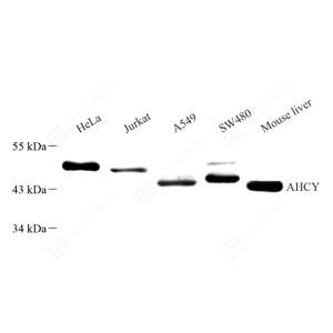 WB检测SAHH蛋白(货号 GB112029). 样品: 经RIPA裂解液(货号G2002)处理的蛋白质. 封闭: 封闭: 3%脱脂牛奶(货号GC310001)溶于TBST溶液, 室温孵育1小时. —抗: 1: 500稀释, 4℃ 孵育过夜. 二抗: HRP标记山羊抗兔IgG (H+L) (货号GB23303), 1: 5000稀释, 室温孵育1小时. |