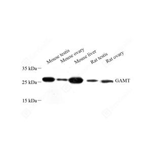 WB检测GAMT蛋白(货号 GB111510). 样品: 经RIPA裂解液(货号G2002)处理的蛋白质. 封闭: 封闭: 3%脱脂牛奶(货号GC310001)溶于TBST溶液, 室温孵育1小时. —抗: 1: 1000稀释, 4℃ 孵育过夜. 二抗: HRP标记山羊抗兔IgG (H+L) (货号GB23303), 1: 5000稀释, 室温孵育1小时. |