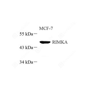 WB检测RIMKA蛋白(货号 GB112717). 样品: 经RIPA裂解液(货号G2002)处理的蛋白质. 封闭: 封闭: 3%脱脂牛奶(货号GC310001)溶于TBST溶液, 室温孵育1小时. —抗: 1: 500稀释, 4℃ 孵育过夜. 二抗: HRP标记山羊抗兔IgG (H+L) (货号GB23303), 1: 5000稀释, 室温孵育1小时. |