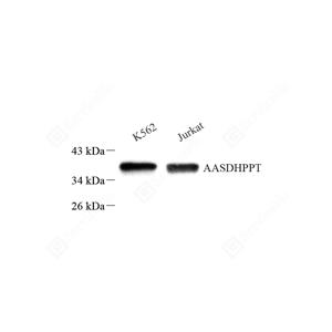 WB检测AASDHPPT蛋白(货号 GB112673). 样品: 经RIPA裂解液(货号G2002)处理的蛋白质. 封闭: 封闭: 3%脱脂牛奶(货号GC310001)溶于TBST溶液, 室温孵育1小时. —抗: 1: 500稀释, 4℃ 孵育过夜. 二抗: HRP标记山羊抗兔IgG (H+L) (货号GB23303), 1: 5000稀释, 室温孵育1小时. |