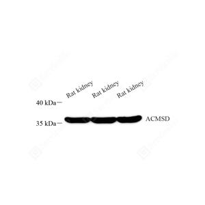 WB检测ACMSD蛋白(货号 GB115153). 样品: 经RIPA裂解液(货号G2002)处理的蛋白质. 封闭: 封闭: 3%脱脂牛奶(货号GC310001)溶于TBST溶液, 室温孵育1小时. —抗: 1: 3000稀释, 4℃ 孵育过夜. 二抗: HRP标记山羊抗兔IgG (H+L) (货号GB23303), 1: 5000稀释, 室温孵育1小时. |
