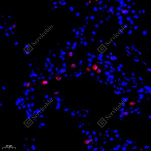IF检测ADI1蛋白(货号 GB111667)(红色). 样品: 大鼠肺, 4%多聚甲醛 (货号G1101) 固定12-24小时. 抗原修复: Tris-EDTA抗原修复液(pH 9.0) (G1203), 98℃, 20分钟. 封闭: 3% BSA(货号GC305010)的PBS溶液, 室温孵育30分钟. —抗: 1: 1200稀释, 4℃ 孵育过夜. 二抗: Cy3标记山羊抗兔IgG (H+L) (货号GB21303), 1: 300稀释, 室温孵育1小时. |