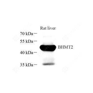 WB检测BHMT2蛋白(货号 GB115370). 样品: 经RIPA裂解液(货号G2002)处理的蛋白质. 封闭: 3%脱脂牛奶(货号GC310001)溶于TBST溶液, 室温孵育1小时. —抗: 1: 2000稀释, 4℃ 孵育过夜. 二抗: HRP标记山羊抗兔IgG (H+L) (货号GB23303), 1: 5000稀释, 室温孵育1小时. |