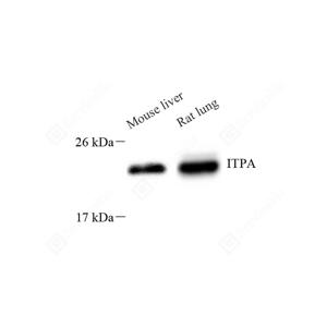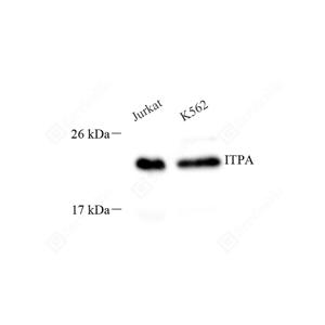 ITPA(Inosine triphosphate pyrophosphatase) catalyzes the pyrophosphohydrolysis of inosine triphosphate (ITP) to inosine monophosphate (IMP).It expresses in the cytoplasm.It can be detected a band of 44 Kda as a homodimer in the western blot though its predictedsize is 21kd.This protein has two isforms with the molecular weight of 20KDa and 21KDa.