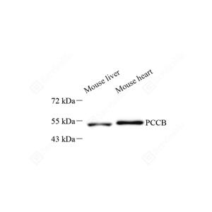 WB检测PCCB蛋白(货号 GB113237). 样品: 经RIPA裂解液(货号G2002)处理的蛋白质. 封闭: 封闭: 3%脱脂牛奶(货号GC310001)溶于TBST溶液, 室温孵育1小时. —抗: 1: 1000稀释, 4℃ 孵育过夜. 二抗: HRP标记山羊抗兔IgG (H+L) (货号GB23303), 1: 5000稀释, 室温孵育1小时. |