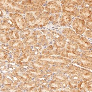 IHC检测PTS/PTPS蛋白(货号 GB114904). 样品: 小鼠肾, 4%多聚甲醛 (货号G1101) 固定12-24小时. 抗原修复: Tris-EDTA抗原修复液 (pH 9.0) (G1203), 98℃, 20分钟. —抗: 1: 800稀释, 4℃ 孵育过夜. 二抗: HRP标记山羊抗兔IgG (H+L) (货号GB23303), 1: 200稀释, 室温孵育1小时. |