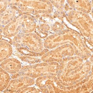 IHC检测PTS/PTPS蛋白(货号 GB114904). 样品: 大鼠肾, 4%多聚甲醛 (货号G1101) 固定12-24小时. 抗原修复: Tris-EDTA抗原修复液 (pH 9.0) (G1203), 98℃, 20分钟. —抗: 1: 800稀释, 4℃ 孵育过夜. 二抗: HRP标记山羊抗兔IgG (H+L) (货号GB23303), 1: 200稀释, 室温孵育1小时. |