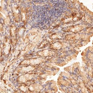 IHC检测PTS/PTPS蛋白(货号 GB114904). 样品: 小鼠克隆细胞, 4%多聚甲醛 (货号G1101) 固定12-24小时. 抗原修复: Tris-EDTA抗原修复液 (pH 9.0) (G1203), 98℃, 20分钟. —抗: 1: 800稀释, 4℃ 孵育过夜. 二抗: HRP标记山羊抗兔IgG (H+L) (货号GB23303), 1: 200稀释, 室温孵育1小时. |