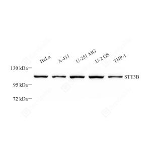 WB检测STT3B蛋白(货号 GB112753). 样品: 经RIPA裂解液(货号G2002)处理的蛋白质. 封闭: 封闭: 3%脱脂牛奶(货号GC310001)溶于TBST溶液, 室温孵育1小时. —抗: 1: 2000稀释, 4℃ 孵育过夜. 二抗: HRP标记山羊抗兔IgG (H+L) (货号GB23303), 1: 5000稀释, 室温孵育1小时. |