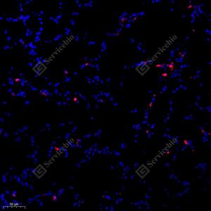 IF检测CD11b蛋白(货号 GB11058)(红色). 样品: 小鼠肺炎(LPS), 4%多聚甲醛 (货号G1101) 固定12-24小时. 抗原修复: Tris-EDTA抗原修复液(pH 9.0) (G1203), 98℃, 20分钟. 封闭: 3% BSA(货号GC305010)的PBS溶液, 室温孵育30分钟. —抗: 1: 500稀释, 4℃ 孵育过夜. 二抗: Cy3标记山羊抗兔IgG (H+L) (货号GB21303), 1: 300稀释, 室温孵育1小时. |