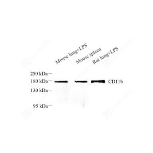WB检测CD11b蛋白(货号 GB113743). 样品: 经RIPA裂解液(货号G2002)处理的蛋白质. 封闭: 封闭: 3%脱脂牛奶(货号GC310001)溶于TBST溶液, 室温孵育1小时. —抗: 1: 1000稀释, 4℃ 孵育过夜. 二抗: HRP标记山羊抗兔IgG (H+L) (货号GB23303), 1: 5000稀释, 室温孵育1小时. |