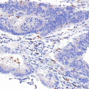 IHC检测CD11b蛋白(货号 GB125693). 样品: 人结肠癌, 4%多聚甲醛 (货号G1101) 固定12-24小时. 抗原修复: 柠檬酸抗原修复液(干粉, pH 6.0) (G1201), 高压锅均匀喷气计时2分钟. —抗: 1: 1000稀释, 4℃ 孵育过夜. 二抗: S-vision免疫组化多聚二抗(山羊抗小鼠), 即用型(货号G1301), 室温孵育20分钟. |