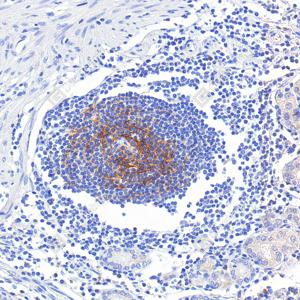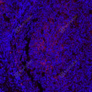 IF检测CD11b蛋白(货号 GB125693)(红色). 样品: 人扁桃体, 4%多聚甲醛 (货号G1101) 固定12-24小时. 抗原修复: 柠檬酸抗原修复液(干粉, pH 6.0) (G1201), 高压锅均匀喷气计时2分钟. 封闭: 3% BSA(货号GC305010)的PBS溶液, 室温孵育30分钟. —抗: 1: 1000稀释, 4℃ 孵育过夜. 二抗: Cy3标记山羊抗小鼠IgG (H+L) (货号GB21301), 1: 300稀释, 室温孵育1小时. |