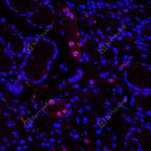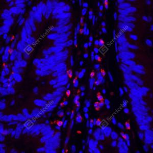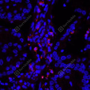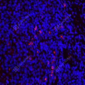 IF检测CD11b蛋白(货号 GB125693)(红色). 样品: 人结肠, 4%多聚甲醛 (货号G1101) 固定12-24小时. 抗原修复: 柠檬酸抗原修复液(干粉, pH 6.0) (G1201), 高压锅均匀喷气计时2分钟. 封闭: 3% BSA(货号GC305010)的PBS溶液, 室温孵育30分钟. —抗: 1: 1000稀释, 4℃ 孵育过夜. 二抗: Cy3标记山羊抗小鼠IgG (H+L) (货号GB21301), 1: 300稀释, 室温孵育1小时. |