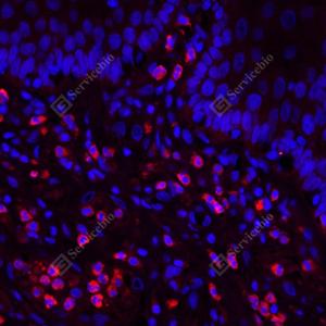 IF检测CD11b蛋白(货号 GB125693)(红色). 样品: 人食管, 4%多聚甲醛 (货号G1101) 固定12-24小时. 抗原修复: 柠檬酸抗原修复液(干粉, pH 6.0) (G1201), 高压锅均匀喷气计时2分钟. 封闭: 3% BSA(货号GC305010)的PBS溶液, 室温孵育30分钟. —抗: 1: 1000稀释, 4℃ 孵育过夜. 二抗: Cy3标记山羊抗小鼠IgG (H+L) (货号GB21301), 1: 300稀释, 室温孵育1小时. |
