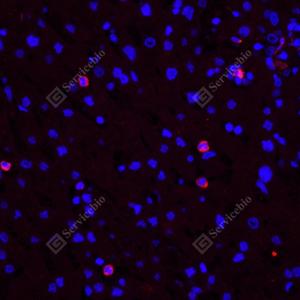 IF检测CD11b蛋白(货号 GB125693)(红色). 样品: 人肝, 4%多聚甲醛 (货号G1101) 固定12-24小时. 抗原修复: 柠檬酸抗原修复液(干粉, pH 6.0) (G1201), 高压锅均匀喷气计时2分钟. 封闭: 3% BSA(货号GC305010)的PBS溶液, 室温孵育30分钟. —抗: 1: 1000稀释, 4℃ 孵育过夜. 二抗: Cy3标记山羊抗小鼠IgG (H+L) (货号GB21301), 1: 300稀释, 室温孵育1小时. |