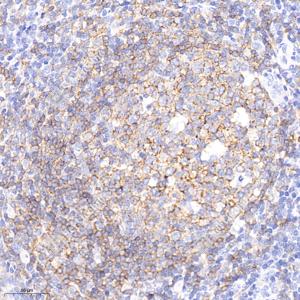IHC检测CD19蛋白(货号 GB12061). 样品: 人淋巴瘤, 4%多聚甲醛 (货号G1101) 固定12-24小时. 抗原修复: 柠檬酸抗原修复液(干粉, pH 6.0) (G1201), 高压锅均匀喷气计时2分钟. —抗: 1: 1000稀释, 4℃ 孵育过夜. 二抗: HRP标记山羊抗小鼠IgG (H+L) (货号GB23301), 1: 200稀释, 室温孵育1小时. |