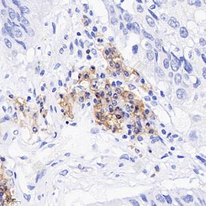 IHC检测CD19蛋白(货号 GB12061). 样品: 人肺鳞状细胞癌, 4%多聚甲醛 (货号G1101) 固定12-24小时. 抗原修复: 柠檬酸抗原修复液(干粉, pH 6.0) (G1201), 高压锅均匀喷气计时2分钟. —抗: 1: 1000稀释, 4℃ 孵育过夜. 二抗: HRP标记山羊抗小鼠IgG (H+L) (货号GB23301), 1: 200稀释, 室温孵育1小时. |