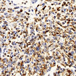 IHC检测CD74蛋白(货号 GB121179). 样品: 人霍奇金淋巴瘤, 4%多聚甲醛 (货号G1101) 固定12-24小时. 抗原修复: 柠檬酸抗原修复液(干粉, pH 6.0) (G1201), 高压锅均匀喷气计时2分钟. —抗: 1: 500稀释, 4℃ 孵育过夜. 二抗: HRP标记山羊抗小鼠IgG (H+L) (货号GB23301), 1: 200稀释, 室温孵育1小时. |