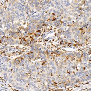 IHC检测CD74蛋白(货号 GB121179). 样品: 人胃癌, 4%多聚甲醛 (货号G1101) 固定12-24小时. 抗原修复: 柠檬酸抗原修复液(干粉, pH 6.0) (G1201), 高压锅均匀喷气计时2分钟. —抗: 1: 500稀释, 4℃ 孵育过夜. 二抗: HRP标记山羊抗小鼠IgG (H+L) (货号GB23301), 1: 200稀释, 室温孵育1小时. |