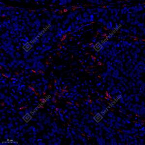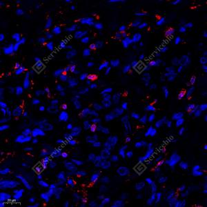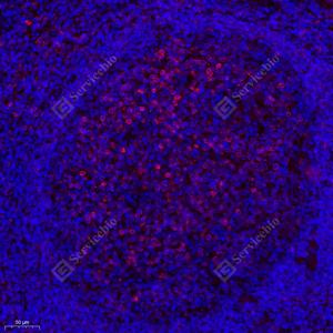 IF检测CD74蛋白(货号 GB121179)(红色). 样品: 人扁桃体, 4%多聚甲醛 (货号G1101) 固定12-24小时. 抗原修复: 柠檬酸抗原修复液(干粉, pH 6.0) (G1201), 高压锅均匀喷气计时2分钟. 封闭: 3% BSA(货号GC305010)的PBS溶液, 室温孵育30分钟. —抗: 1: 500稀释, 4℃ 孵育过夜. 二抗: Cy3标记山羊抗小鼠IgG (H+L) (货号GB21301), 1: 300稀释, 室温孵育1小时. |