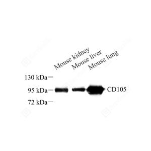 WB检测CD105蛋白(货号 GB12020). 样品: 经RIPA裂解液(货号G2002)处理的蛋白质. 封闭: 封闭: 3%脱脂牛奶(货号GC310001)溶于TBST溶液, 室温孵育1小时. —抗: 1: 1000稀释, 4℃ 孵育过夜. 二抗: HRP标记山羊抗小鼠IgG (H+L) (货号GB23301), 1: 5000稀释, 室温孵育1小时. |
