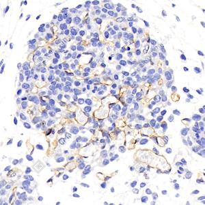 IHC检测CD105蛋白(货号 GB113503). 样品: 小鼠Lewis细胞皮下移植瘤模型, 4%多聚甲醛 (货号G1101) 固定12-24小时. 抗原修复: 柠檬酸抗原修复液(干粉, pH 6.0) (G1201), 98℃, 20分钟. —抗: 1: 500稀释, 4℃ 孵育过夜. 二抗: HRP标记山羊抗兔IgG (H+L) (货号GB23303), 1: 200稀释, 室温孵育1小时. |