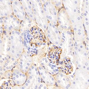 IHC检测CD105蛋白(货号 GB113503). 样品: 小鼠肾, 4%多聚甲醛 (货号G1101) 固定12-24小时. 抗原修复: 柠檬酸抗原修复液(干粉, pH 6.0) (G1201), 98℃, 20分钟. —抗: 1: 500稀释, 4℃ 孵育过夜. 二抗: HRP标记山羊抗兔IgG (H+L) (货号GB23303), 1: 200稀释, 室温孵育1小时. |