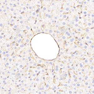 IHC检测CD105蛋白(货号 GB113503). 样品: 小鼠肝, 4%多聚甲醛 (货号G1101) 固定12-24小时. 抗原修复: 柠檬酸抗原修复液(干粉, pH 6.0) (G1201), 98℃, 20分钟. —抗: 1: 500稀释, 4℃ 孵育过夜. 二抗: HRP标记山羊抗兔IgG (H+L) (货号GB23303), 1: 200稀释, 室温孵育1小时. |