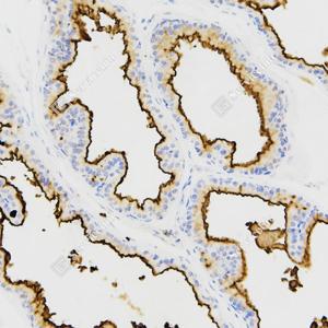 IHC检测CD10蛋白(货号 GB121122). 样品: 小鼠前列腺, 4%多聚甲醛 (货号G1101) 固定12-24小时. 抗原修复: 柠檬酸抗原修复液(干粉, pH 6.0) (G1201), 高压锅均匀喷气计时2分钟. —抗: 1: 3000稀释, 4℃ 孵育过夜. 二抗: HRP标记山羊抗小鼠IgG (H+L) (货号GB23301), 1: 200稀释, 室温孵育1小时. |