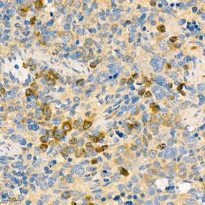 IHC检测CD27蛋白(货号 GB11582). 样品: 大鼠脾, 4%多聚甲醛 (货号G1101) 固定12-24小时. 抗原修复: 柠檬酸抗原修复液(干粉, pH 6.0) (G1201), 98℃, 20分钟. —抗: 1: 1000稀释, 4℃ 孵育过夜. 二抗: HRP标记山羊抗兔IgG (H+L) (货号GB23303), 1: 200稀释, 室温孵育1小时. |