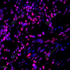 IF检测SOCS1蛋白(货号 GB11372)(红色). 样品: 人卵巢癌, 4%多聚甲醛 (货号G1101) 固定12-24小时. 抗原修复: Tris-EDTA抗原修复液(pH 9.0) (G1203), 98℃, 20分钟. 封闭: 3% BSA(货号GC305010)的PBS溶液, 室温孵育30分钟. —抗: 1: 500稀释, 4℃ 孵育过夜. 二抗: Cy3标记山羊抗兔IgG (H+L) (货号GB21303), 1: 300稀释, 室温孵育1小时. |