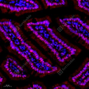 IF检测SOCS1蛋白(货号 GB11372)(红色). 样品: 小鼠小肠, 4%多聚甲醛 (货号G1101) 固定12-24小时. 抗原修复: Tris-EDTA抗原修复液(pH 9.0) (G1203), 98℃, 20分钟. 封闭: 3% BSA(货号GC305010)的PBS溶液, 室温孵育30分钟. —抗: 1: 500稀释, 4℃ 孵育过夜. 二抗: Cy3标记山羊抗兔IgG (H+L) (货号GB21303), 1: 300稀释, 室温孵育1小时. |